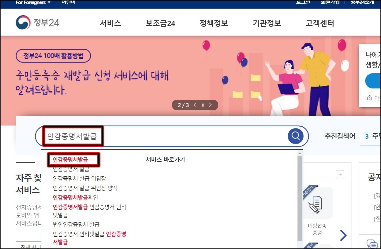 정부24 홈페이지에 들어가시면 중간에 위치한 검색창에 '인감증명서발급'이라고 입력해주세요