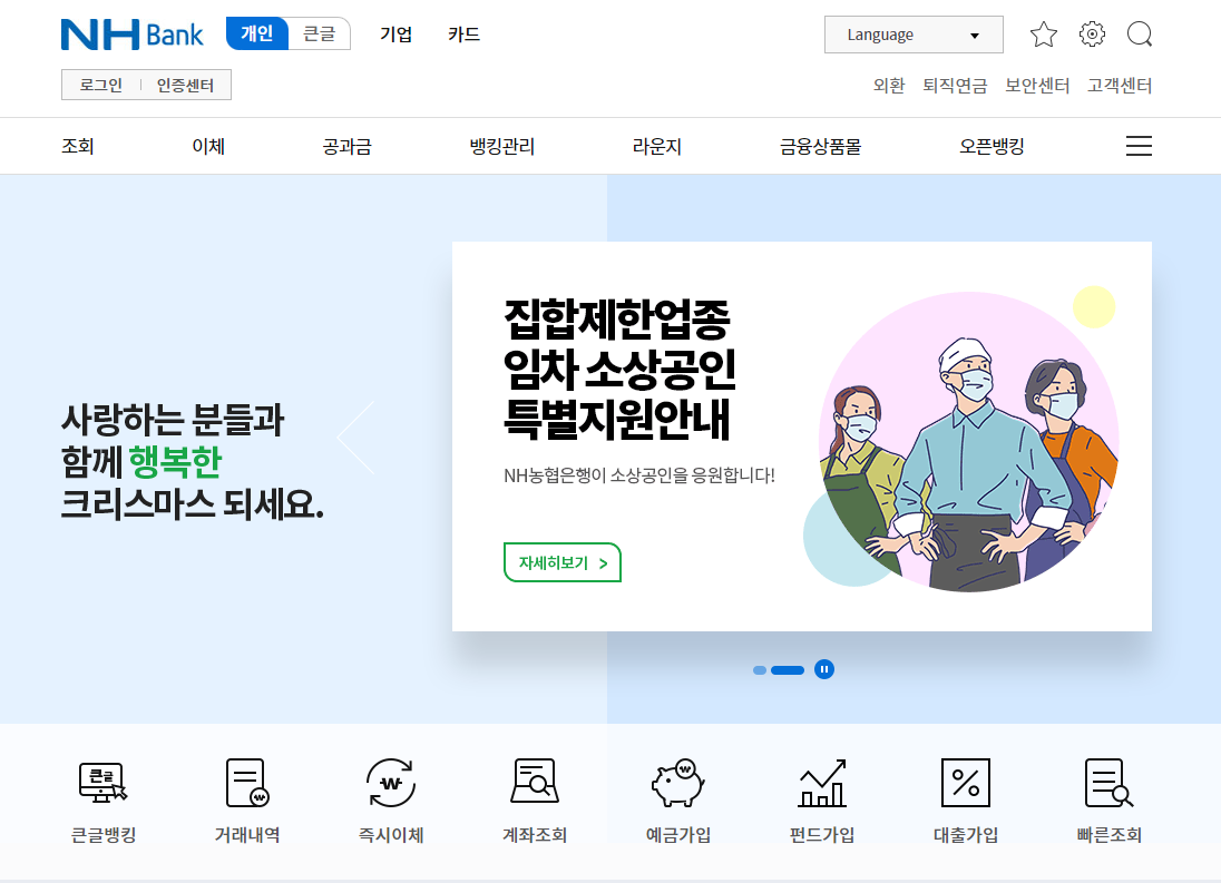 이곳이 농협 인터넷뱅킹 홈페이지 메인화면입니다. 개인회원이나 기업회원 둘다 이용이 가능하며 구분은 왼쪽 상단을 보시면 됩니다. 조회기능부터 이체와 공과금 뱅킹관리와 라운지, 금융상품몰, 그리고 오픈뱅킹이 있습니다.